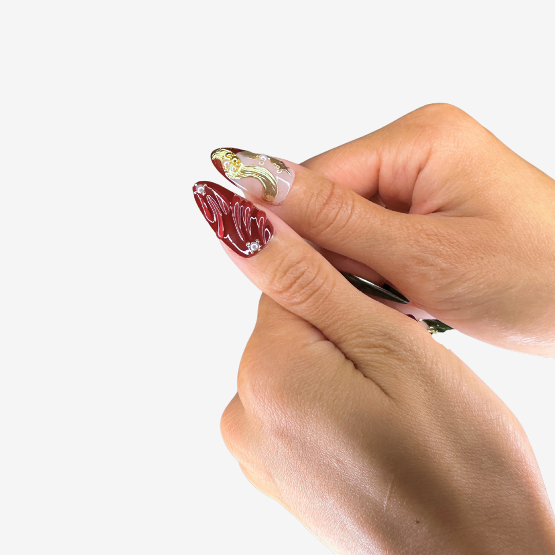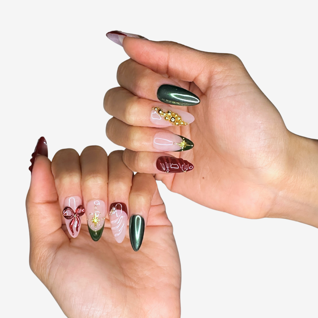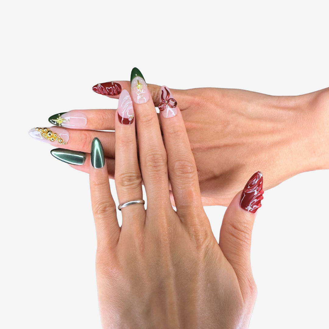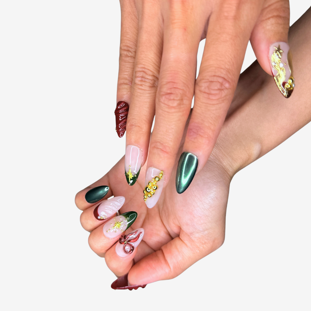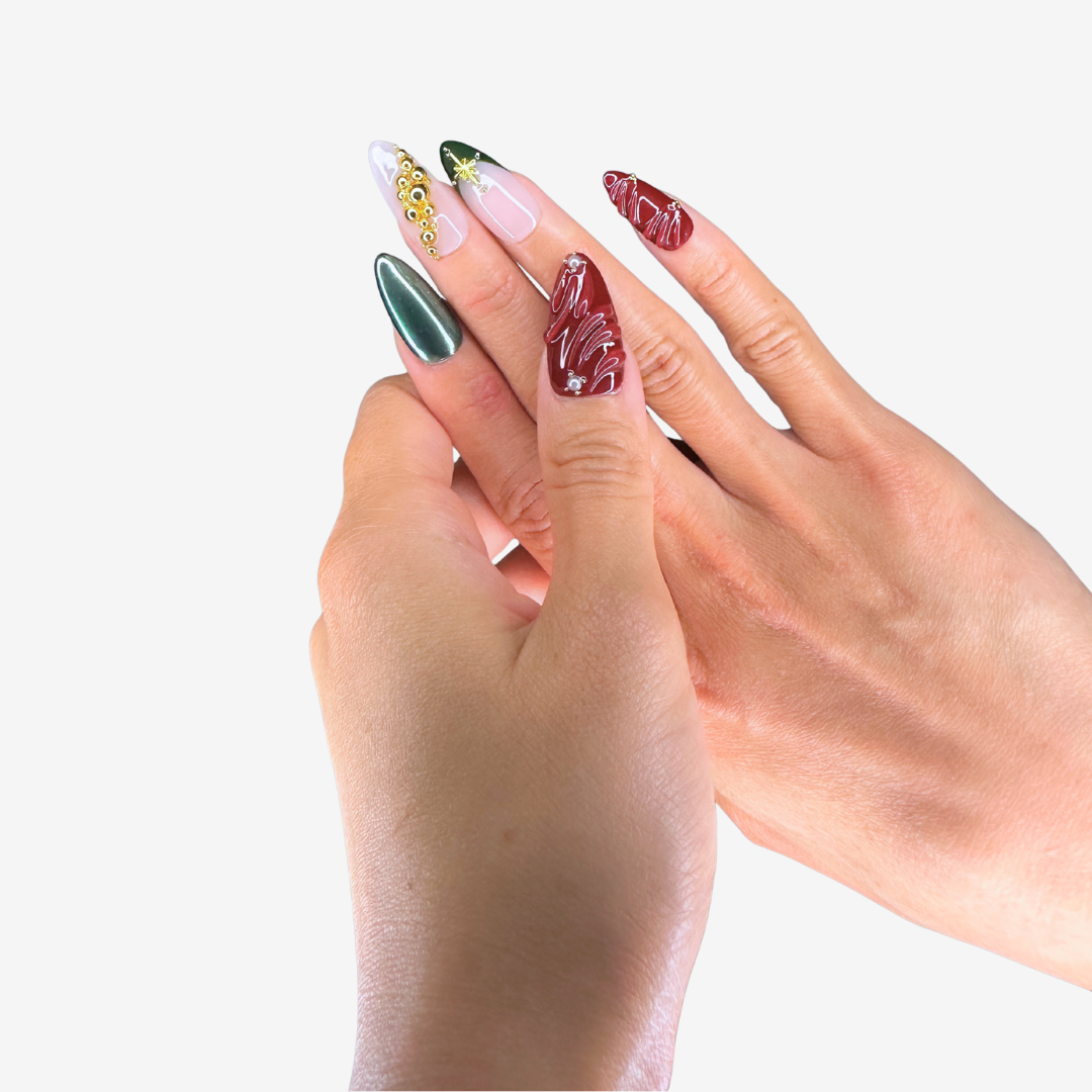 Deck your digits in festive flair with Holiday Haze! These show-stopping nails feature a stunning trio of red, chrome green, and gold, adorned with playful bows, shimmering disco balls, and twinkling stars. Three-dimensional twirls add depth and dimension for a truly eye-catching holiday look. Perfect for celebrations, parties, or anyone ready to sparkle through the season.