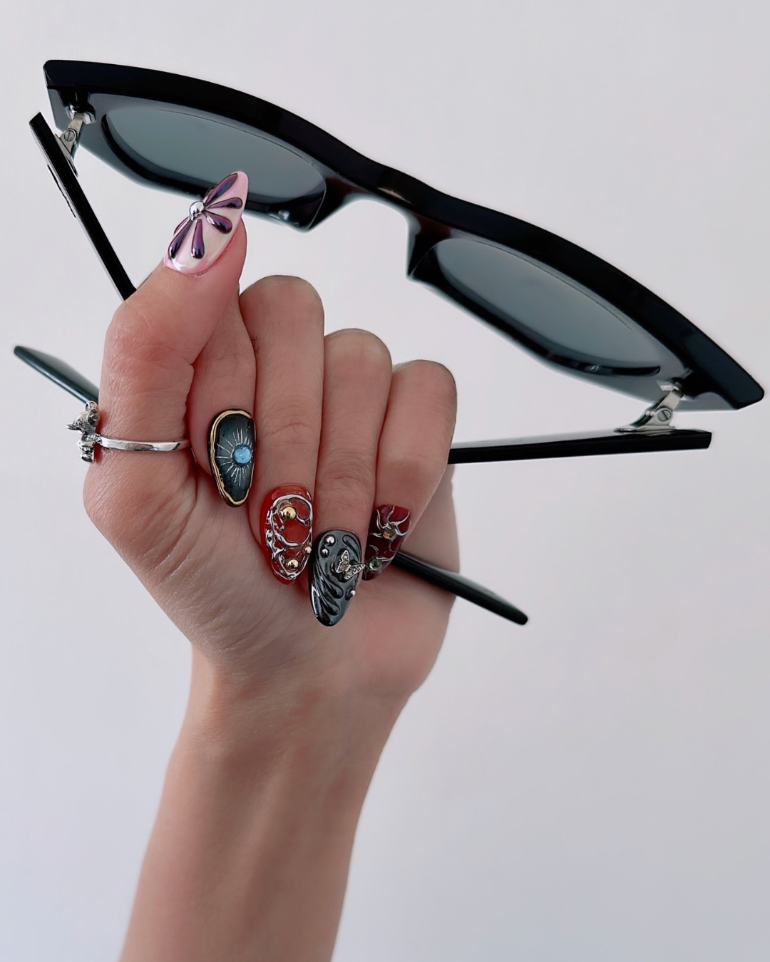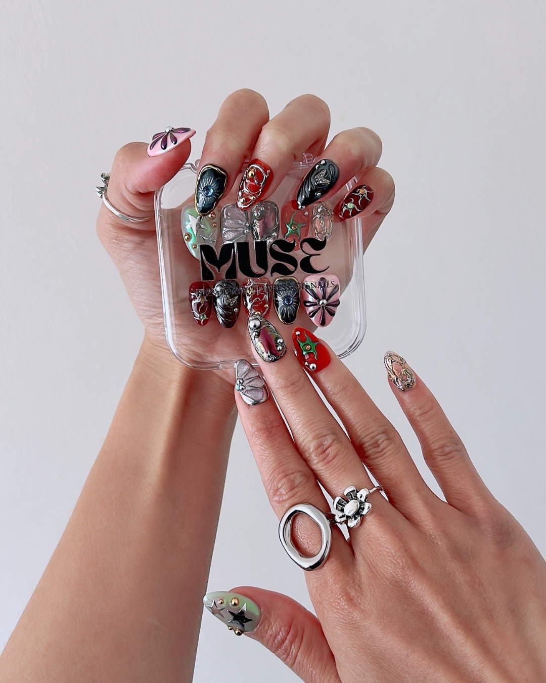 Elevate your nail game with Trippie, featuring mesmerising colourful chrome designs that catch the light from every angle. Each nail showcases intricate 3D silver and gold swirls, delicate stars, and shimmering butterfly wings for a truly enchanting look. Perfect for those who love bold, eye-catching nail art that makes a statement.