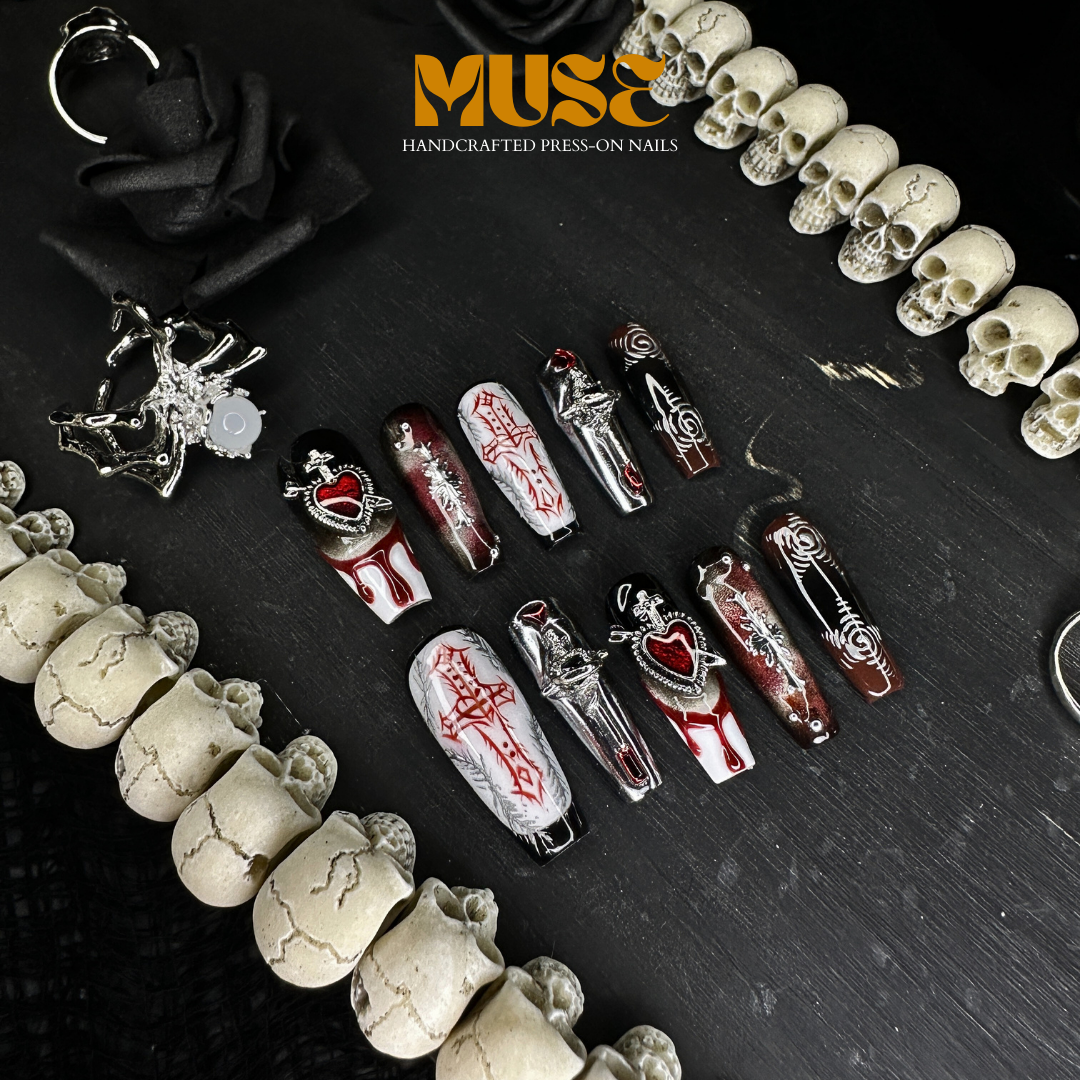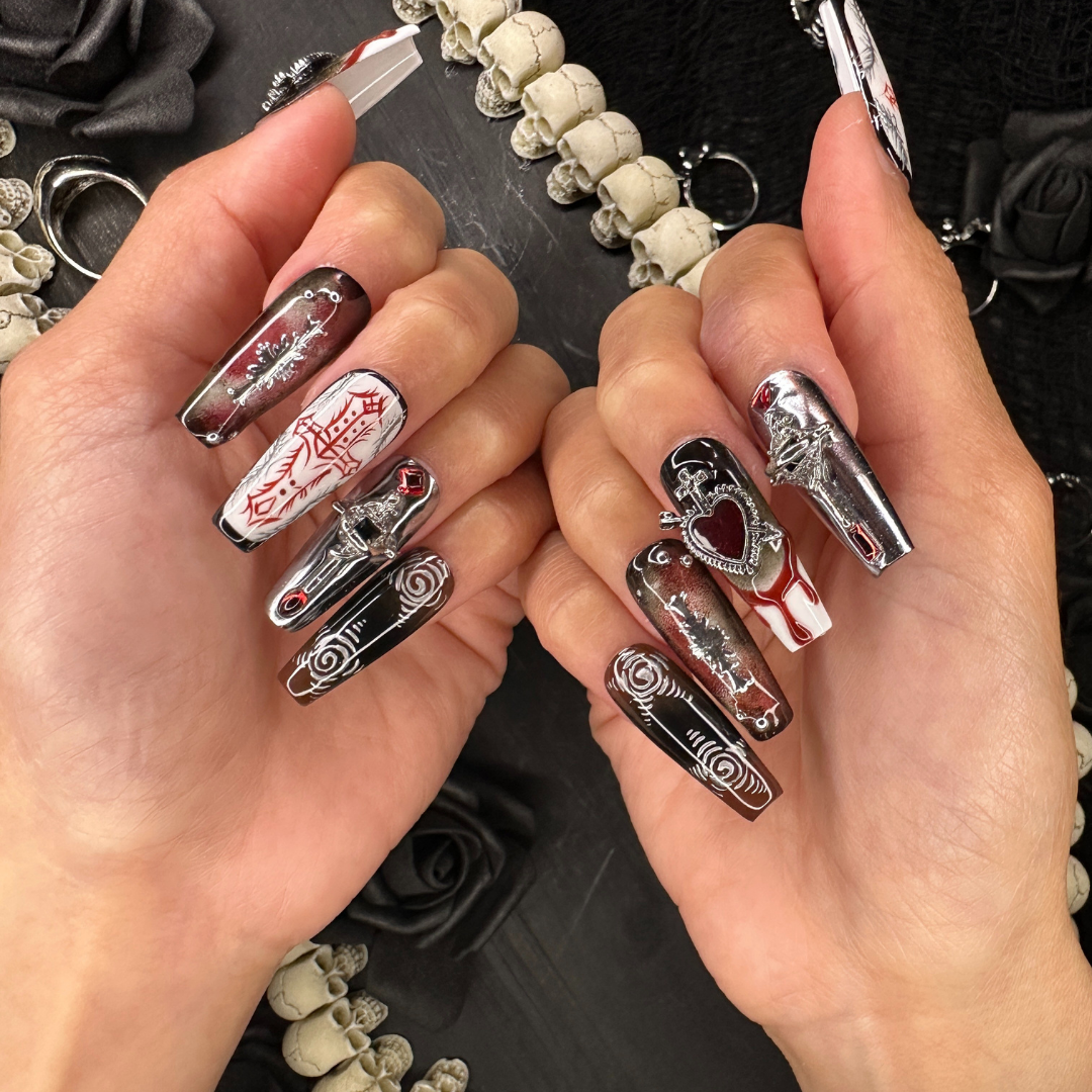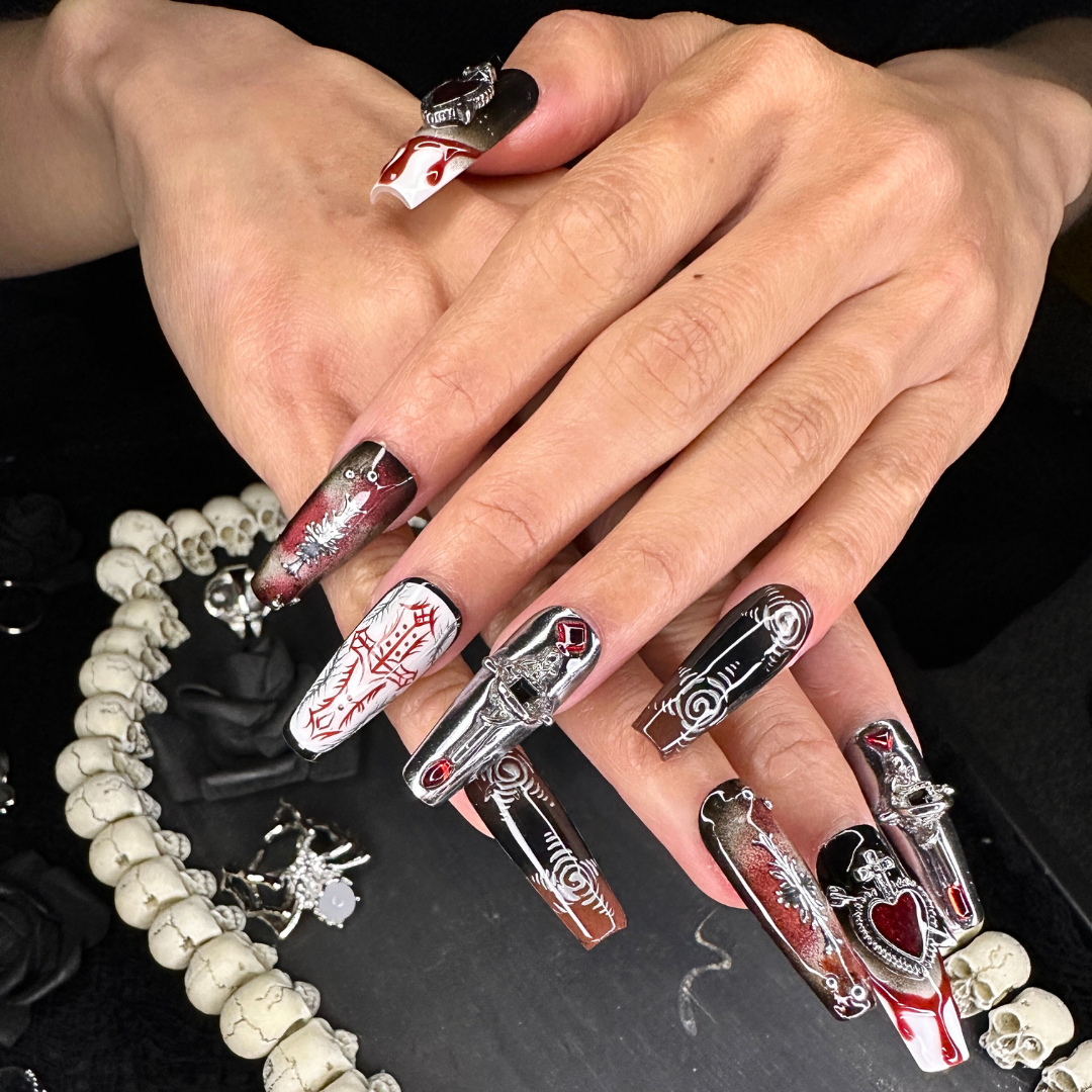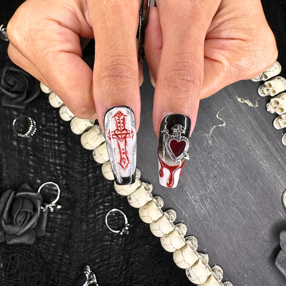 Unholy Vow captures the daring gothic spirit with silver charms including gothic crosses, red hearts, and dripping blood motifs.